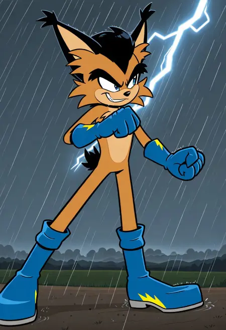 Lightning Lynx, brown fur, blue eyes, black hair, bushy black eyebrows, black tail, bushy fur, blue lightning gloves, blue lightning boots