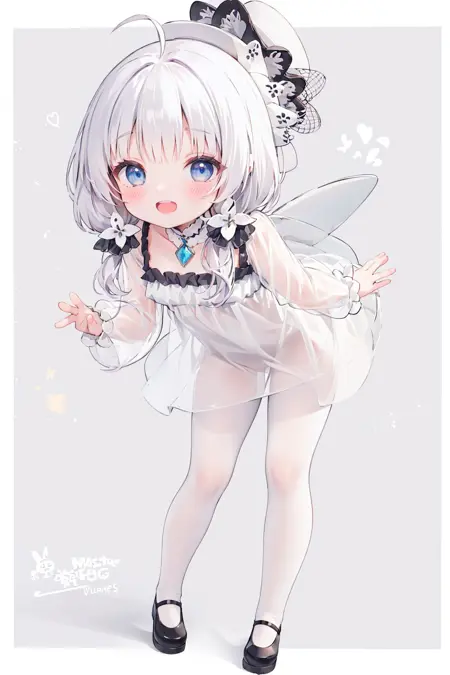 프롬프트: 흰 머리카락, 긴 머리카락, 낮은 트윈테일, 아호게, 파란 눈, 이빨, 머리 장신구, 흰 팬티후스, 투명한 소매, 흰 머리 장신구, 메리 제인, 가상의 날개.