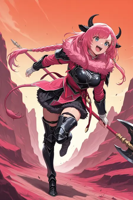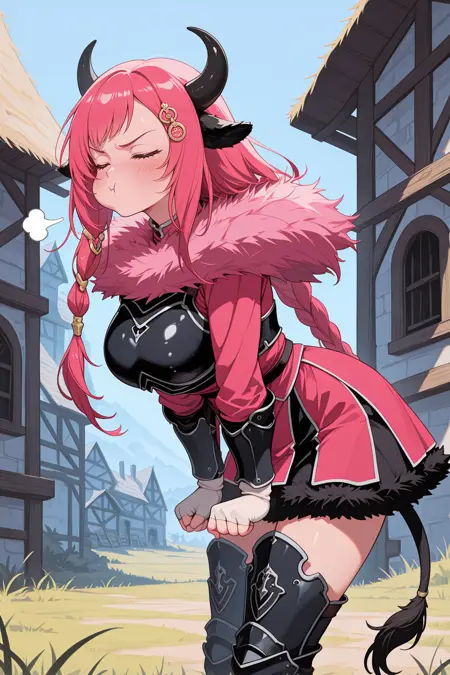그녀의 전형적인 외모를 위해 "머리 장식, 털 소매, 갑옷 드레스, 짧은 드레스, 검은 갑옷, 분홍 드레스, 검은 치마, 긴 소매, 흰 장갑, 손가락 없는 장갑, 갑옷 부츠, 허벅지 부츠, 검은 부츠, 소 꼬리"를 추가하세요.