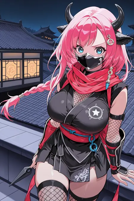 트리거 단어는 "fesdcn"이며, "분홍색 머리카락, 긴 머리카락, 뿔, 소 귀, 단일 땋은 머리, 파란 눈"이 필수입니다.