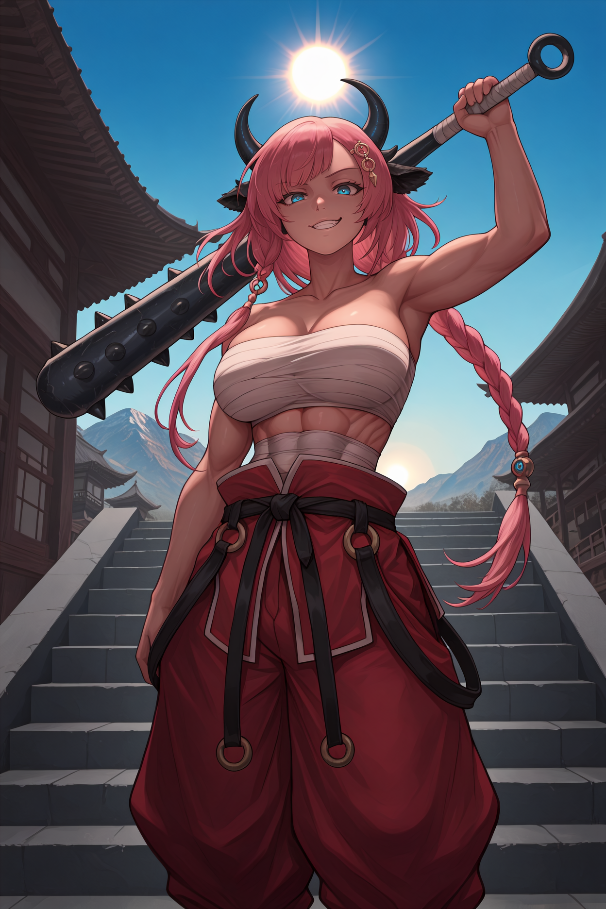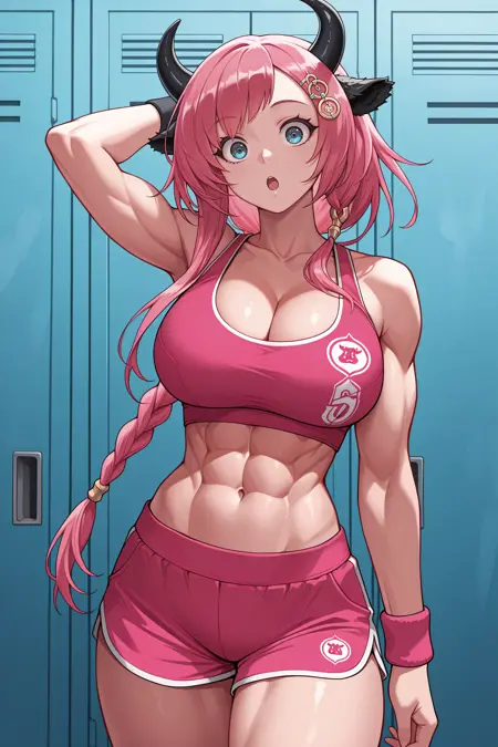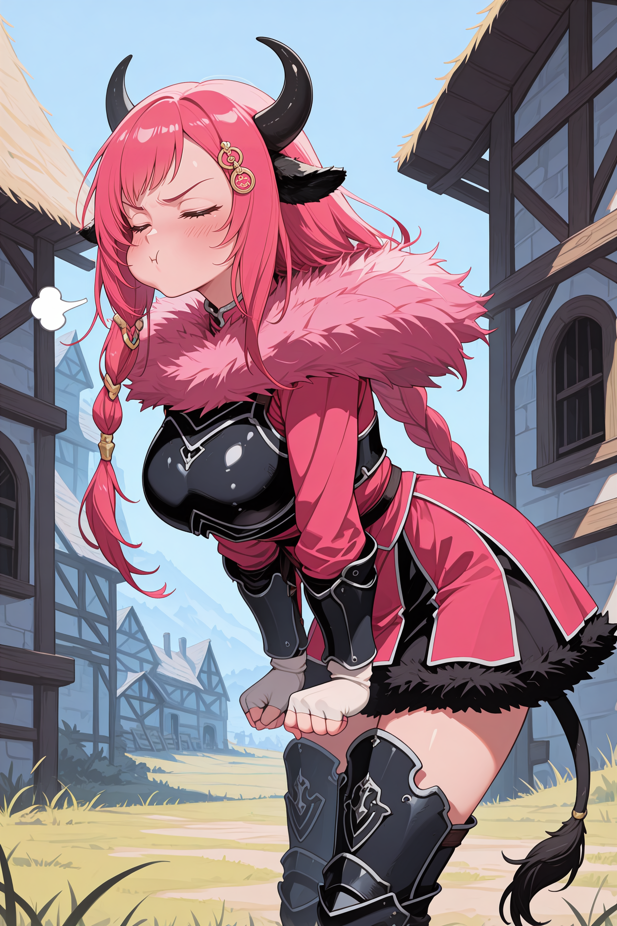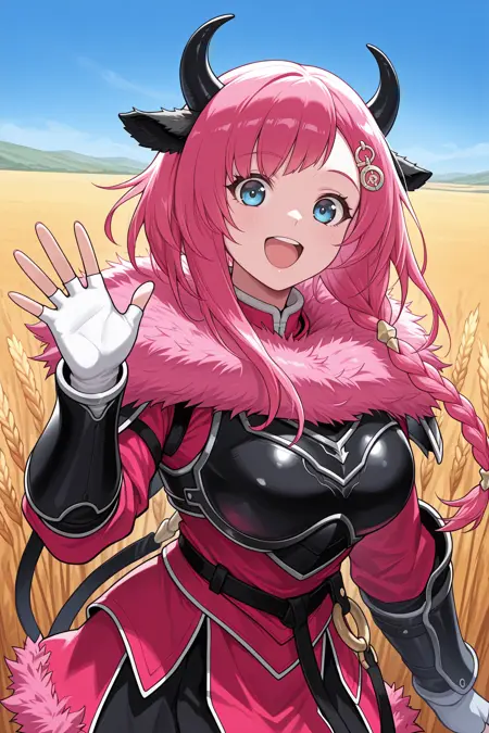 为呈现她的典型外观,请添加 "发饰,毛皮领,盔甲连衣裙,短裙,黑色盔甲,粉色连衣裙,黑色裙子,长袖,白色手套,露指手套,盔甲靴,大腿靴,黑色靴子,牛尾"。
