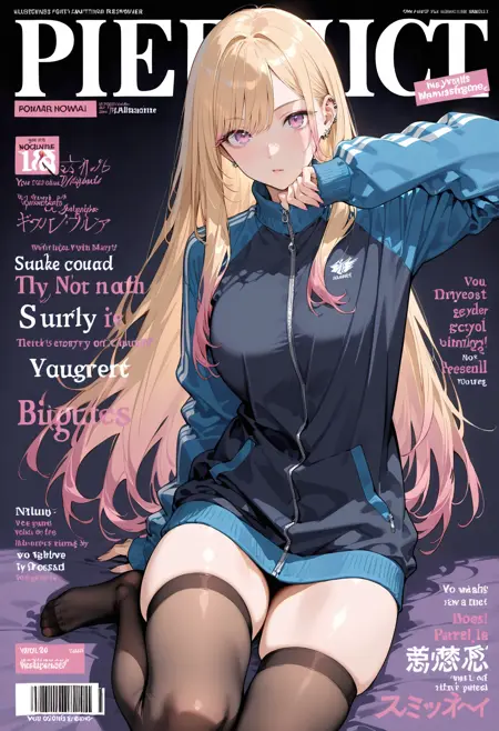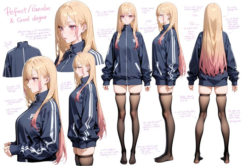 의상 2: 흘린 앞머리, 매우 긴 머리, 허벅지 긴 양말, 재킷, 신발 없음, 스커트 인덴테이션, 트랙 재킷, 검은 허벅지 긴 양말, 긴 소매, 가슴, 페어싱, 귀 개구멍, 파란 재킷, 색상 끝, 손목을 넘는 소매, 귀걸이, 보석, 지퍼, 지퍼 풀탭, 큰 가슴, 검은 재킷, 산업용 페어싱, 갈색 허벅지 긴 양말, 바벨 페어싱, 바지 없음, 절대 리ョウ이키