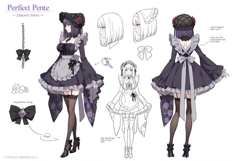 코스프레 옷 2: CosplayCus_1,1girl, 보라색 눈, 보라색 머리, 검은 머리, 중간 길이 머리, 짧은 머리, 밥컷, 앞머리, 둔한 앞머리, 가발, 머리 꽃, 헤어밴드, 허벅지 긴 양말, 보닛, 가슴, 가터 스트랩, 체인, 드레스, 검은 허벅지 긴 양말, 하이힐, 체인 리드, 프릴, 넥타이, 큰 가슴, 검은 신발, 긴 소매, 플로럴 프린트, 검은 넥타이, 칼라, 검은 드레스, 머리 장식, 프릴 드레스, 프릴 소매, 검은 칼라, 넓은 소매, 검은 헤어밴드, 분리형 칼라, 헤드기어, 레이스 트림, 레이스, 에프론, 검은 머리장식, 신발