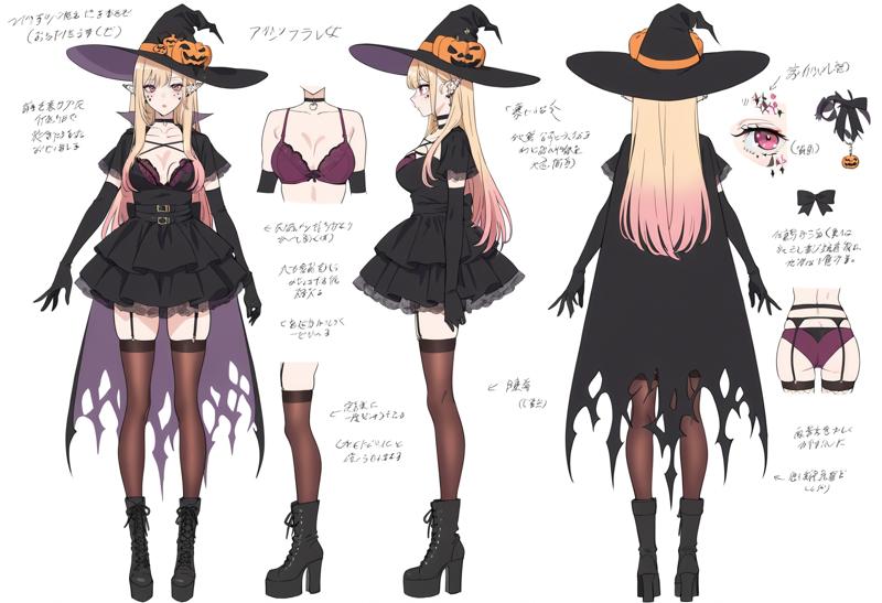 코스프레 옷 1: 가슴, 모자, 장갑, 허벅지 긴 양말, 마녀 모자, 가터 스트랩, 보석, 귀걸이, 검은 장갑, 부츠, 피시넷, 드레스, 할로윈 복장, 하이힐, 뾰족한 귀, 팔꿈치 장갑, 거미줄 무늬, 귀 피어싱, 피어싱, 검은 신발, 피시넷 허벅지 긴 양말, 큰 가슴, 하이힐 부츠, 검은 드레스, 인더스트리얼 피어싱, 중간 크기 가슴, 검은 허벅지 긴 양말, 대체 복장, 컬러링된 끝부분, 바벨 피어싱, 리본, 망토, 가루, 레이스 트림, 치마, 보라색 브라, 레이스, 얼굴 문신, 검은 리본, 검은 머리장식, 브라, 초크 목걸이, 여러 개의 귀걸이, 젯타이 루이키, 여러 개의 피어싱, 속옷, 짧은 소매, 플랫폼 신발, 짧은 드레스, 문신, 레이스 트림 다리 장식