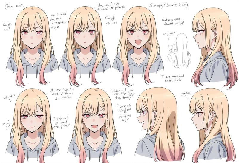외모: 1소녀, 빨간 눈, 분홍 눈, 보라색 눈, 금발, 분홍 헤어, 그라데이션 헤어, 다색 헤어, 이톤 헤어, 긴 머리, 앞머리