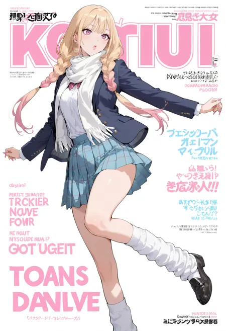 대안 헤어스타일 아우트피트 1: 어깨 위 머리카락, 트윈테일, 땋은 머리, 트윈 브레이드, 갈루, 코갈, 스카프, 치마, 느슨한 양말, 양말, 재킷, 학교 유니폼, 신발, 주름 치마, 흰 양말, 흰 스카프, 검은 신발, 파란 치마, 파란 재킷, 긴 소매, 미니스커트, 로퍼, 블레이저, 레그 워머, 셔츠, 오픈한 옷, 대안 복장, 체크 치마, 체크, 오픈 재킷, 검은 재킷