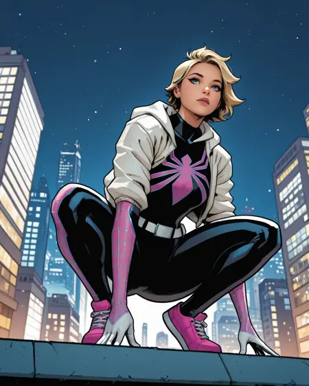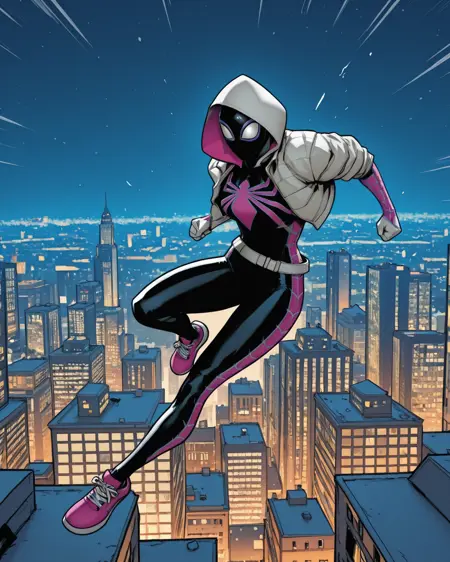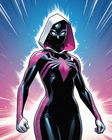 触发词:gwenghostspider, 面具, 帽兜, 连体衣, 外套, 腰带, 运动鞋