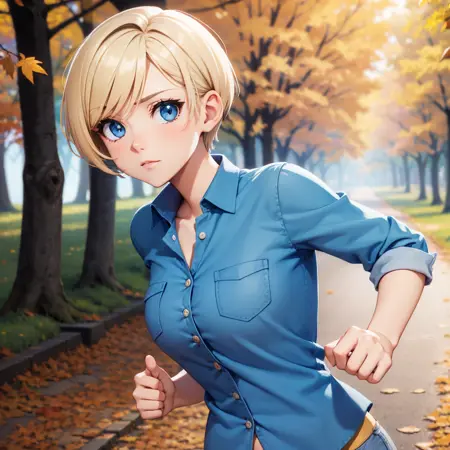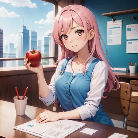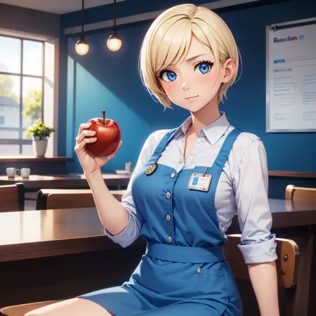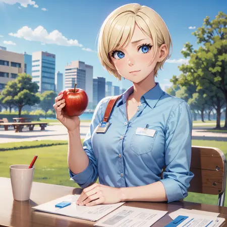 캡션: woman, blue blouse with pocket, buttons, id card badge, short blonde hair, blue eyes, sitting, holding red apple, wooden desk, hand on papers, cup with red pen on desk, chair, from front, blush, blue wall, wooden panels, window, cityscape, tree