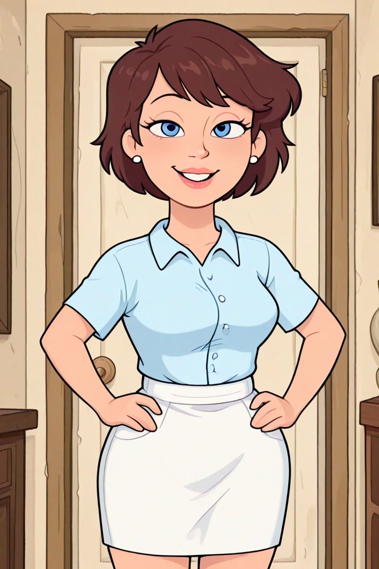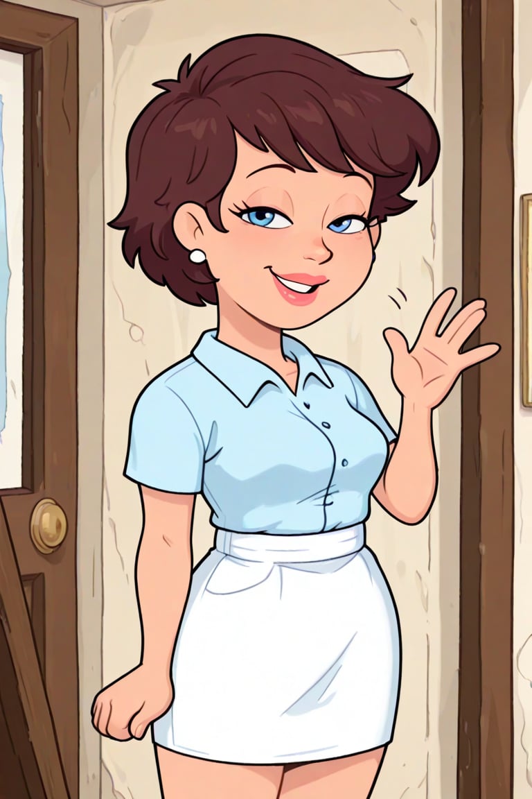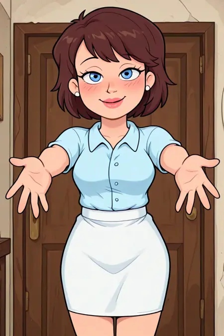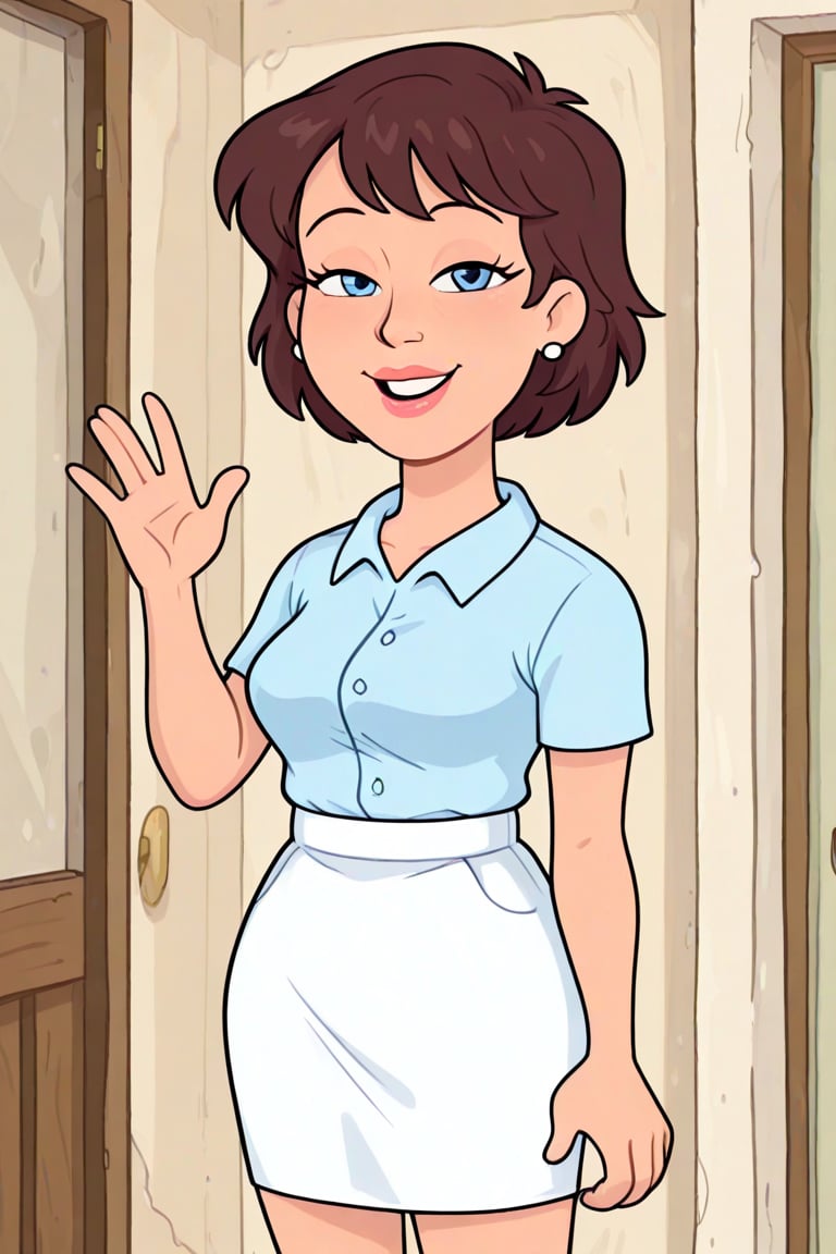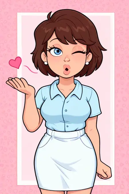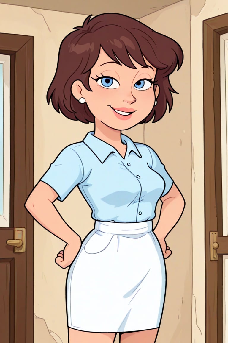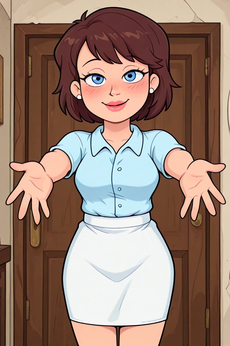 短い茶色の髪、前髪、青い目、白いピアス、ふっくらとした唇、薄い青のボタンダウン襟の短袖ブラウス、白いフィットスカート、白いバレエシューズ、