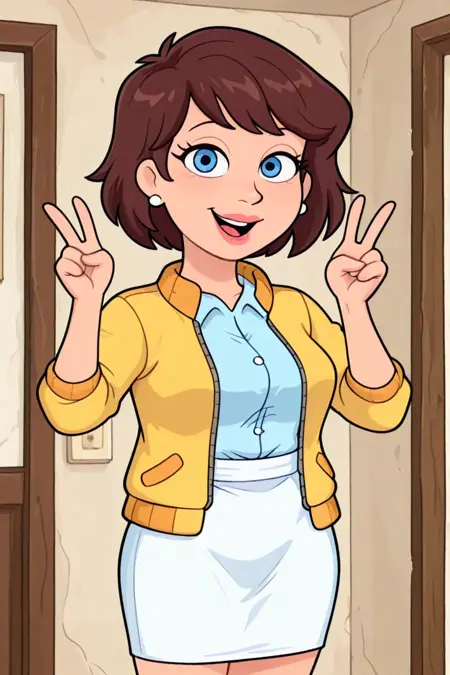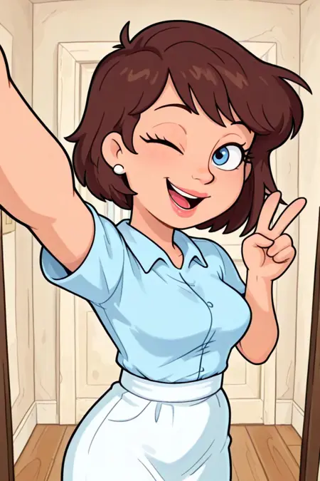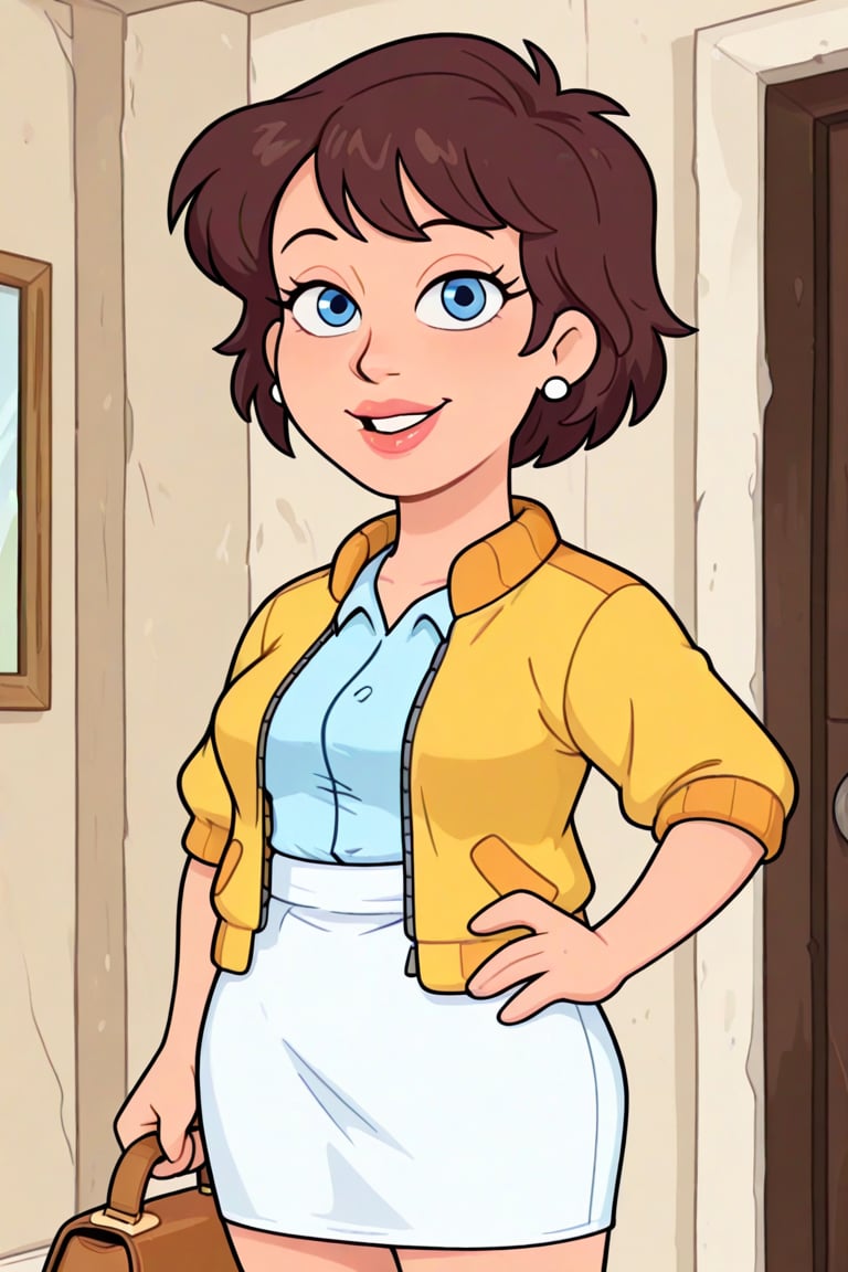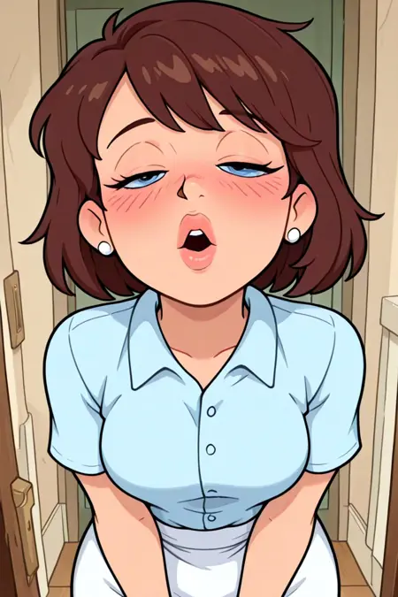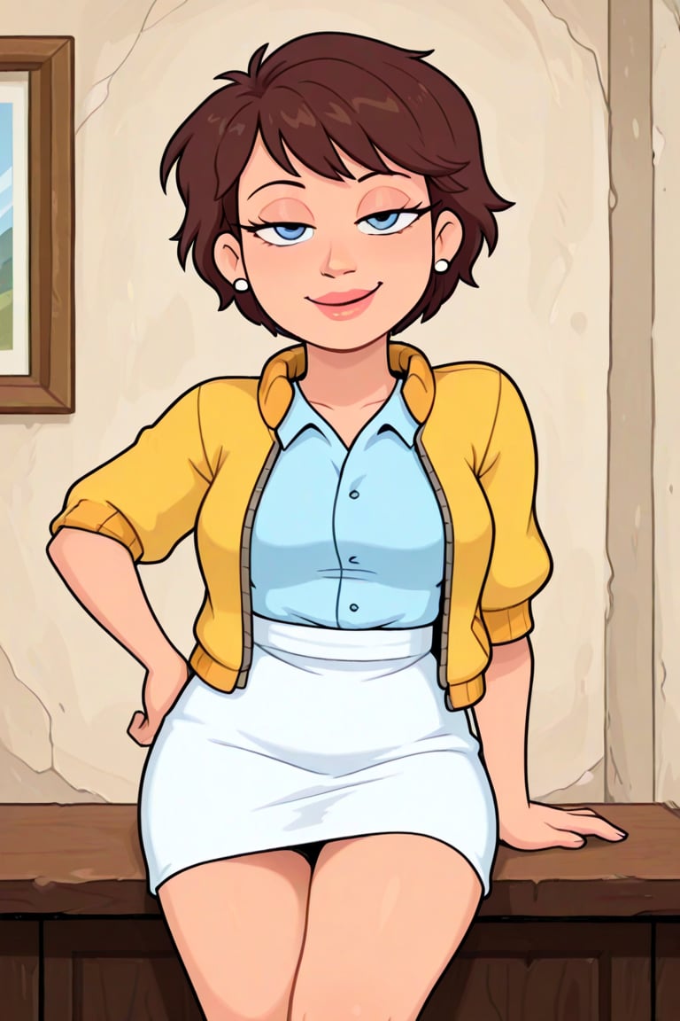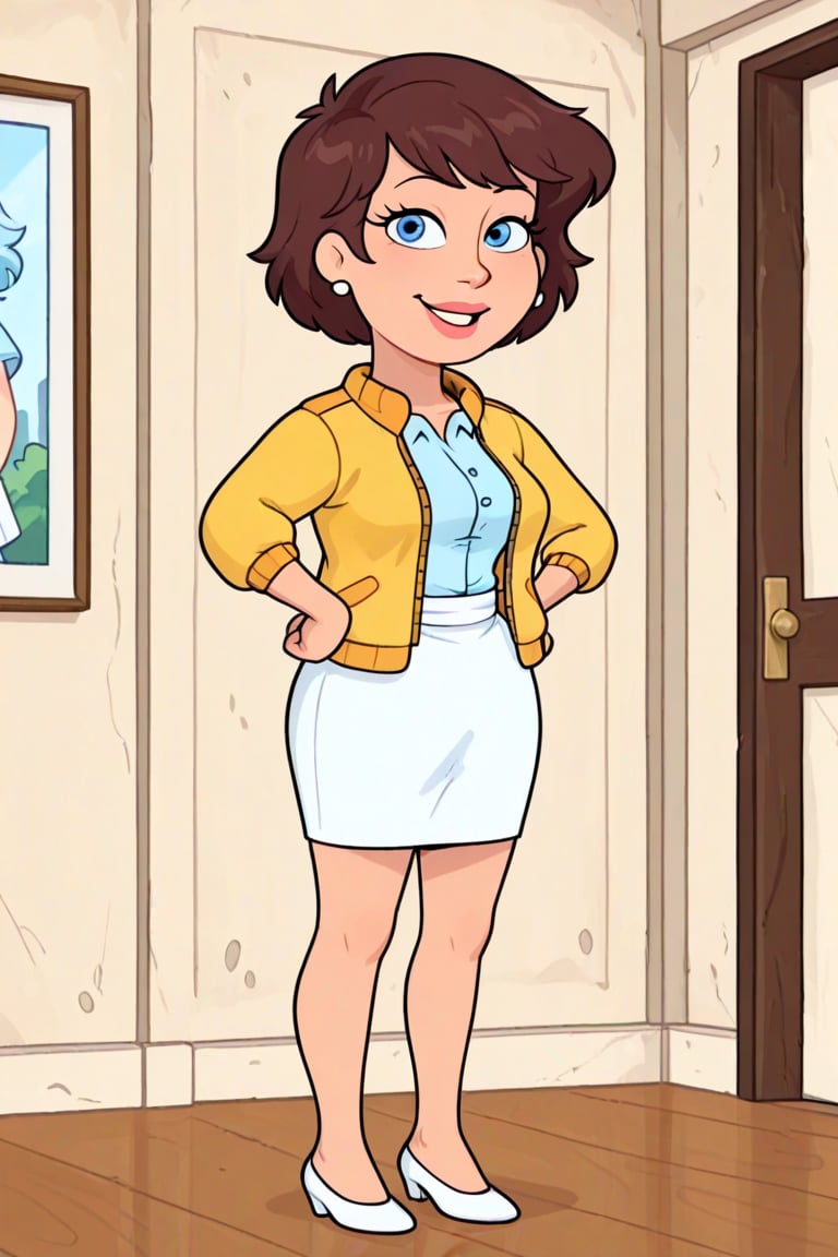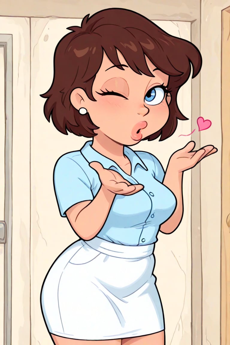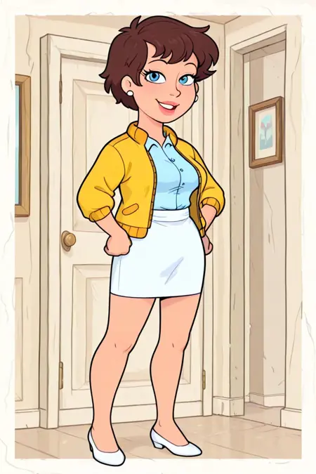 短い茶色の髪、前髪、青い目、白いピアス、ふっくらとした唇、薄い青のボタンダウン襟の短袖ブラウス、白いフィットスカート、白いバレエシューズ、