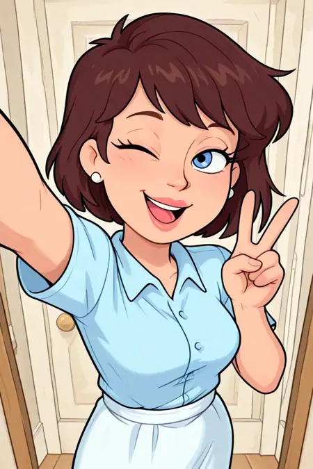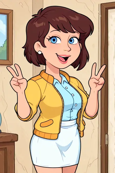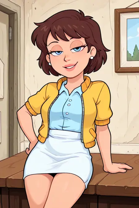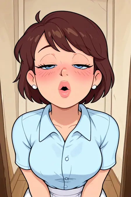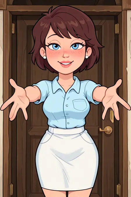 short brown hair, bangs, blue eyes, white stud earrings, full lips, light blue button-down collared short-sleeved blouse, white fitted skirt, white ballet pumps,
