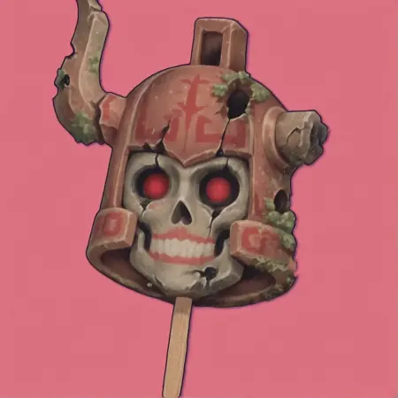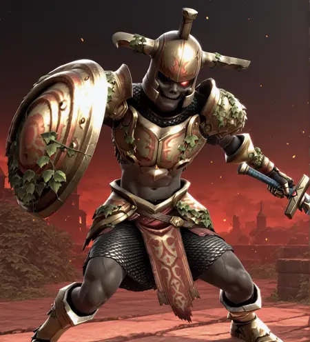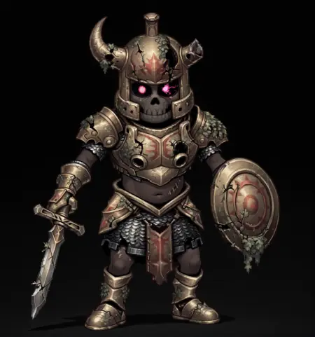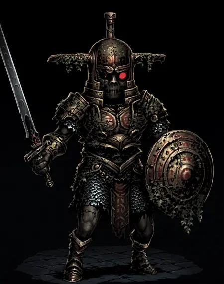 HerosShade, armor, armored boots, undead, dark gray skin, glowing eye, one eyed, red eye, missing eye, empty eye socket, single empty eye, bare legs, gold armor, brass armor, chainmail, horned helmet, broken horn, cracked armor, navel,