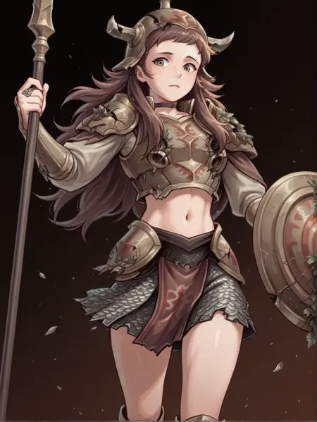 The helmet's horns are inconsistent, they can sometimes generate as horns that curve upwards instead of straight horizontal horns. The curved horns tag in negative can help but still not consistently. to get his skin to generate the most consistently, add bare legs in positive, and black clothes and undershirt in negatives, as it may think his gray skin should be clothes instead.