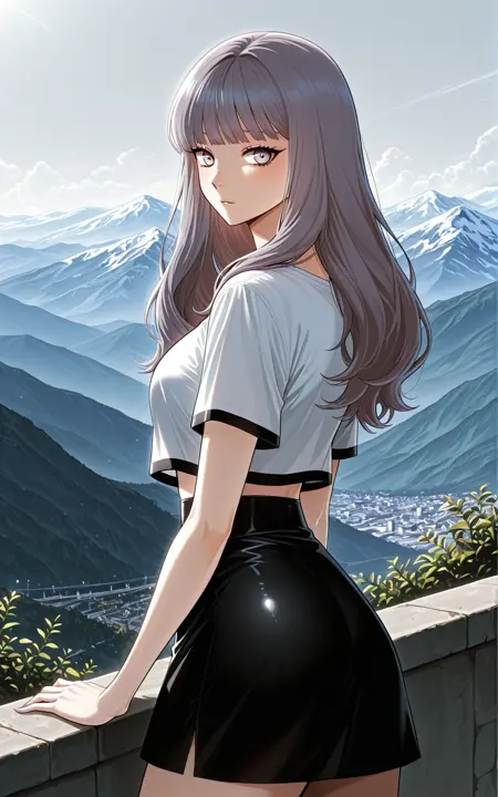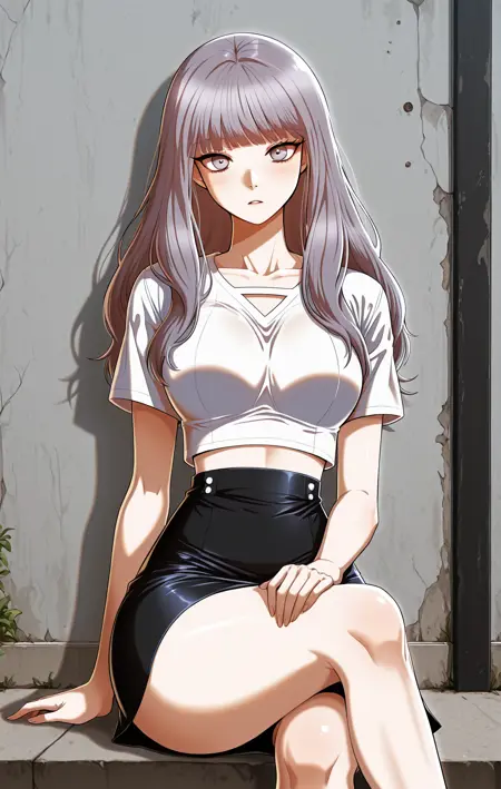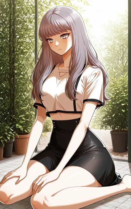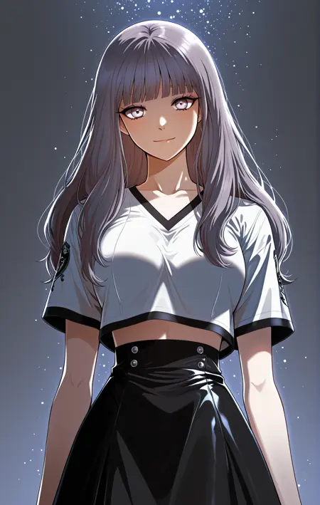 サンファ_outfit2、白いクロップドトップ、黒いトリム、お腹見せ、胸元カットアウト、Vネック、短めの袖、黒いヘム、黒いスカート、短いスカート、ハイウエストスカート、