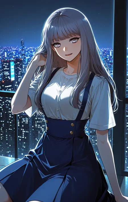 白いシャツ、短めの袖、青いサスペンダースカート、青いスカート、ハイウエストスカート、スカートにボタンあり、