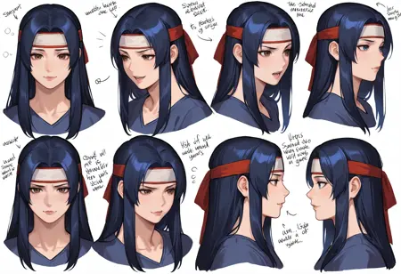 외모: 1소녀, 파란 눈, 갈색 눈, 검은 머리, 긴 머리, 앞머리, 헤드밴드, 파란 머리