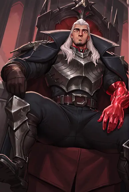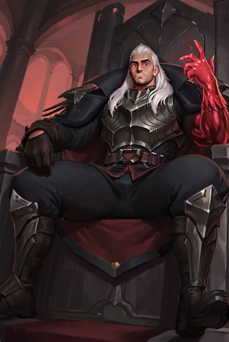 swain l0l, long hair,white hair,red eyes,facial hair,breastplate,armor,red hand,single red arm,belt,glove,black coat,coat,coat over shoulder, boots