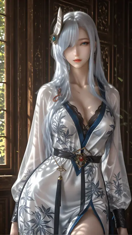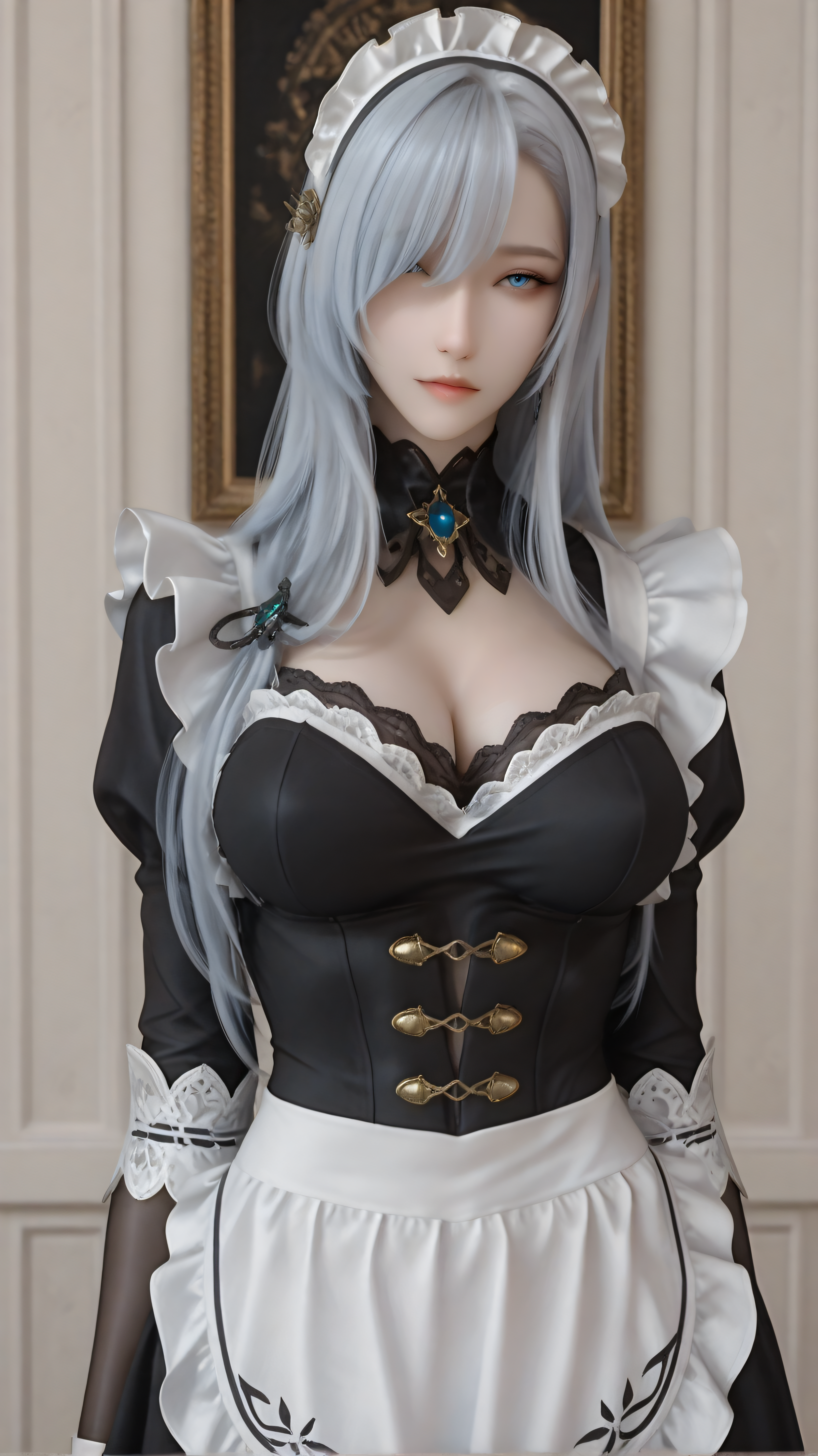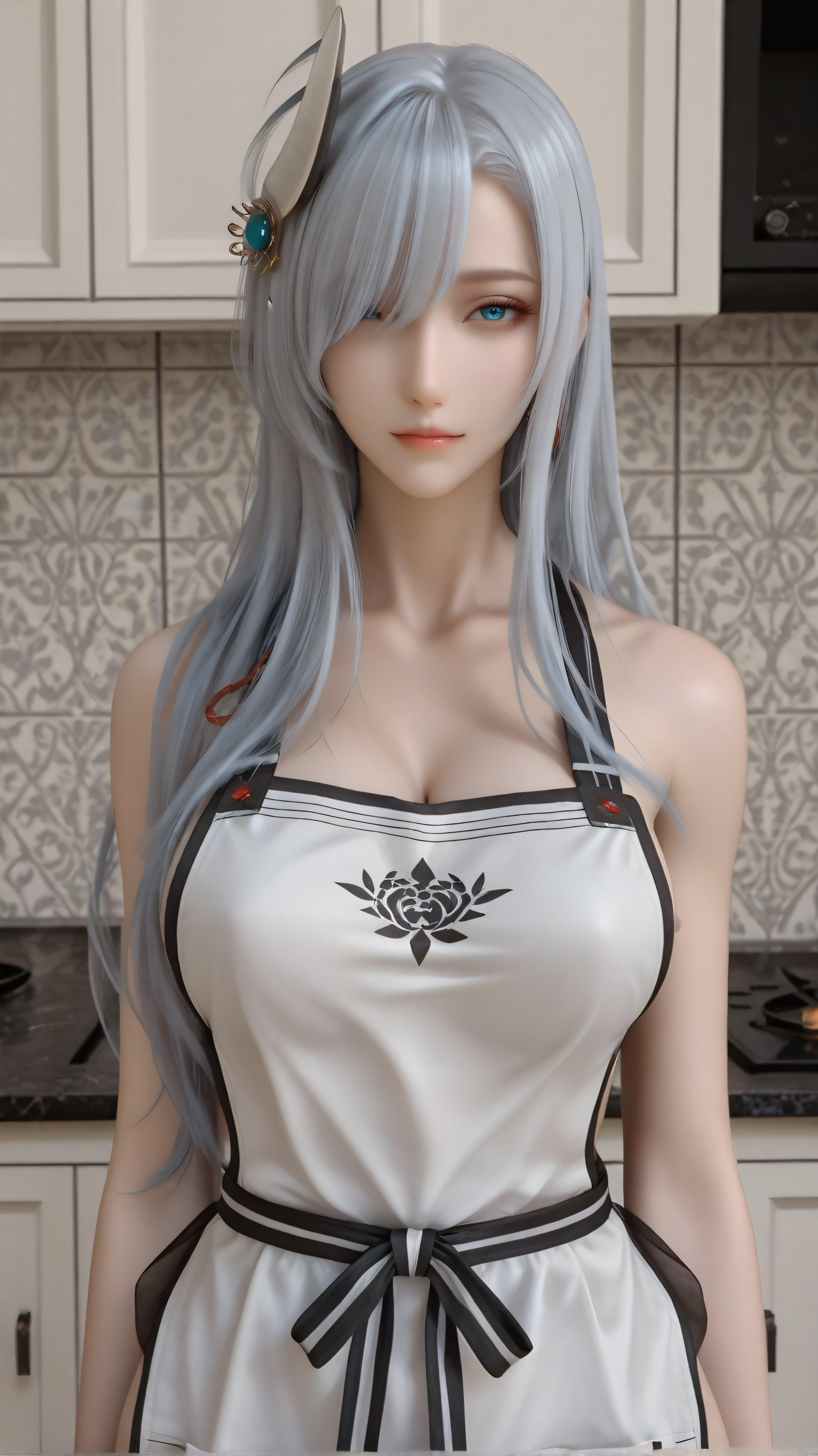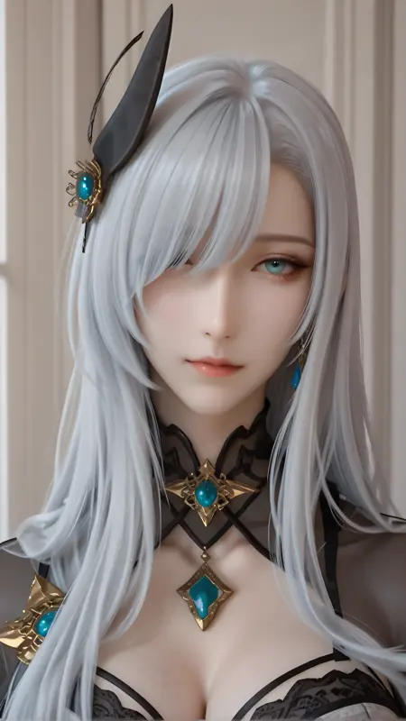 TAG:1girl, solo, 青い目, 長髪, 片方の目に髪がかかる, 髪飾り, 白髪