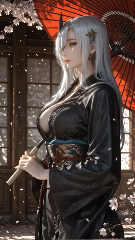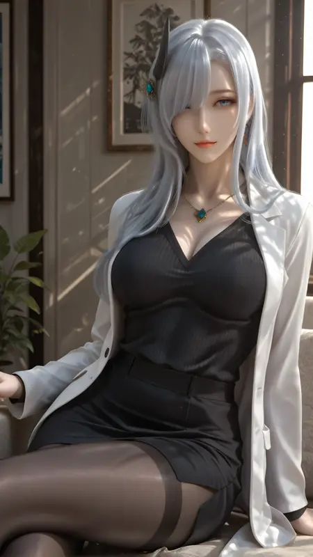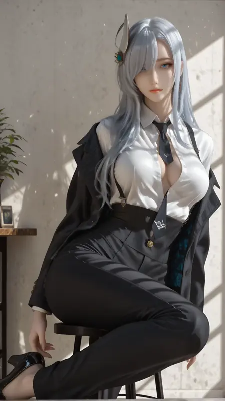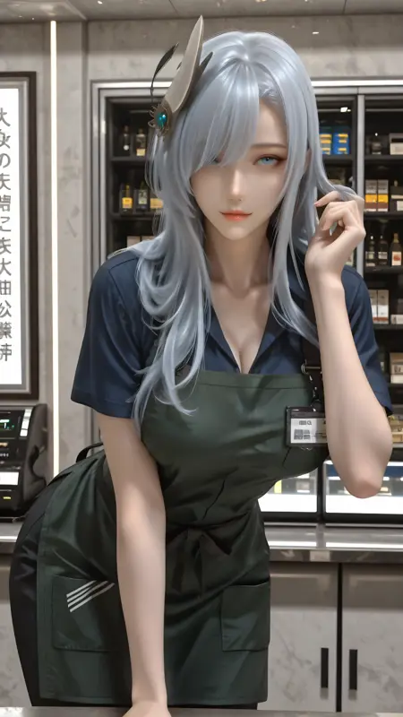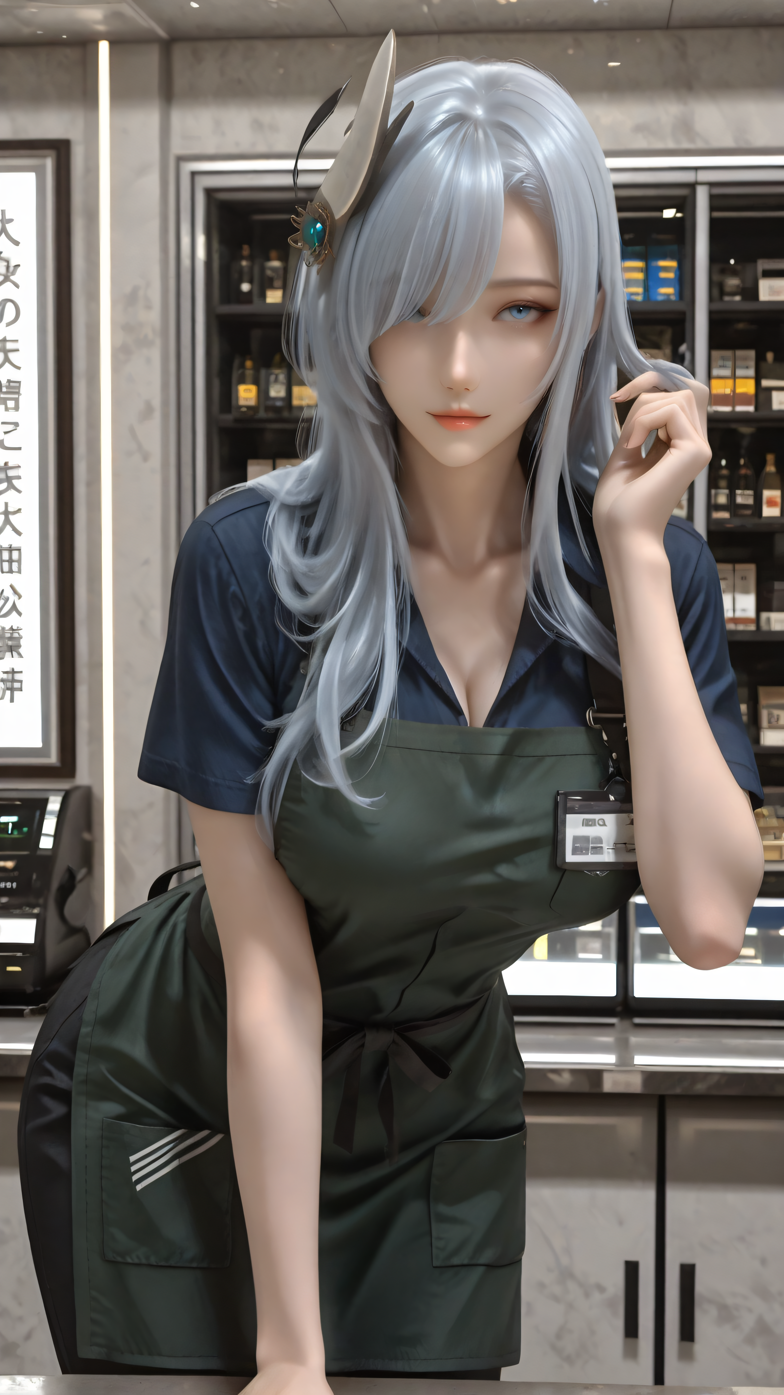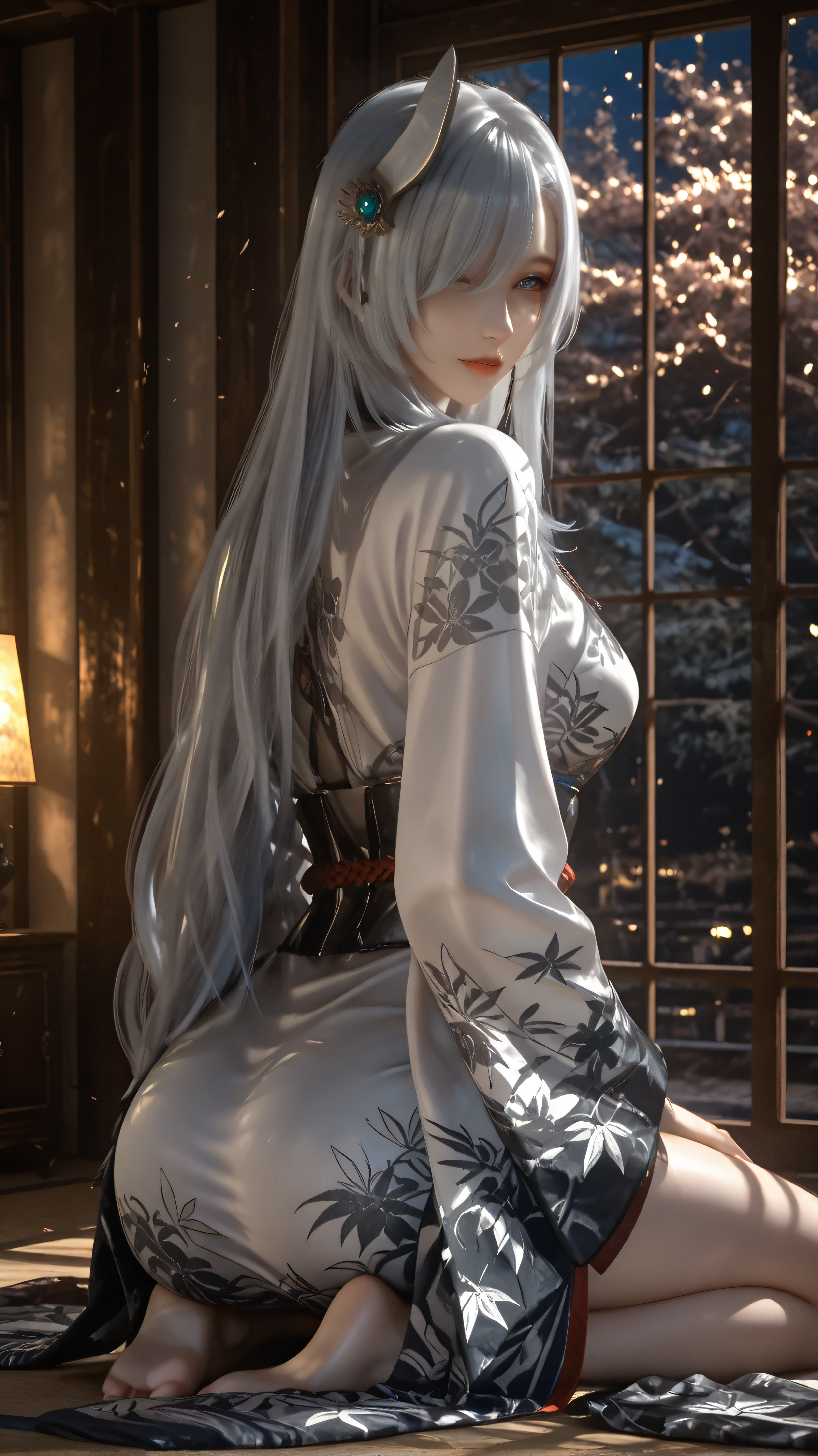 TAG:1girl, solo, 青い目, 長髪, 片方の目に髪がかかる, 髪飾り, 白髪