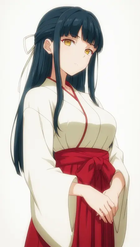 ((anime coloring)), masterpiece, best quality, amazing quality, iori, 1girl, long hair, blue hair, yellow eyes, medium breasts, hair ribbon, white ribbon, miko, solo, pose, standing, looking at viewer, from front, ((((white background, simple background))))