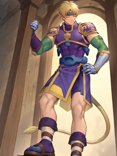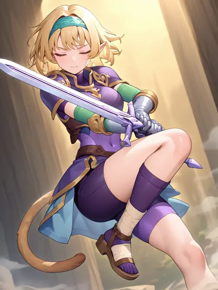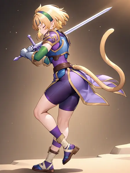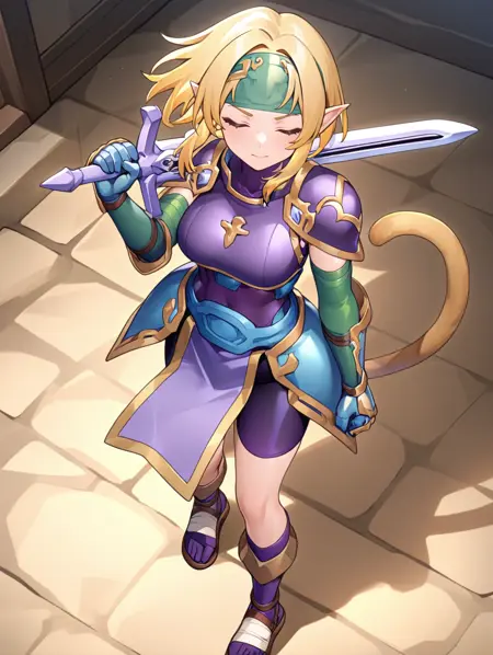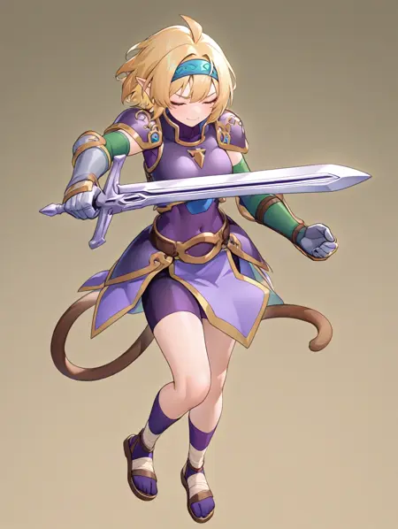 プロンプト例: done,blonde hair,hairband,pointy ears,closed eyes,armor,purple bodysuit,gauntlets,monkey tail,sandals,bandage boots,bike shorts,green elbow gloves,purple socks,holding sword,over skirt,