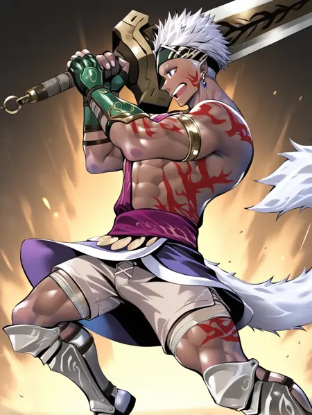 prompt example :siusu,white hair,hairband,tattoo,earrings,black fingerless gloves,arm ring,light brown shorts,tape,silver greaves,white tail,muscular male,green gauntlets,holding weapon,huge weapon,sword,