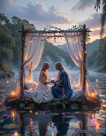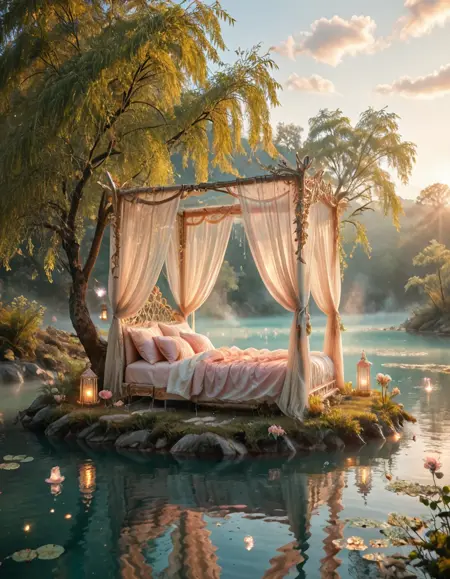 屋内のエルフ的またはエルフ風のベッドルームを、お好みの屋外シーンと組み合わせて作成できます。デフォルトでは、滝の有無にかかわらず、夜の森です。