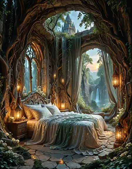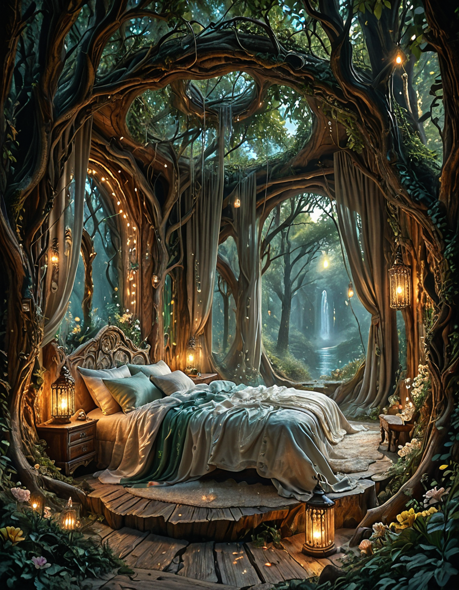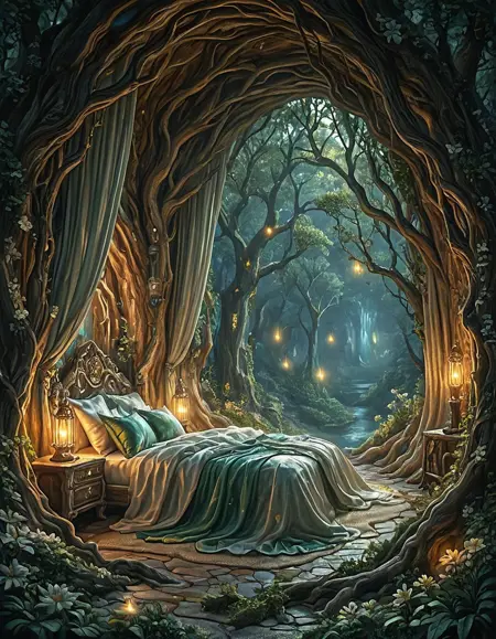 고대 나무 안에 있는 우아한 엘프 스타일 침실, 생체 발광 정맥이 흐르는 빛나는 나무 벽, 달빛이 내리는 숲으로 열리는 아치형 크리스탈 창문, 실크 시트가 놓인 천정 침대, 마법적인 빛을 비추는 떠다니는 등불, 덩굴과 빛나는 꽃들, 평온한 신비로운 분위기, 판타지 리얼리즘, 매우 상세하게