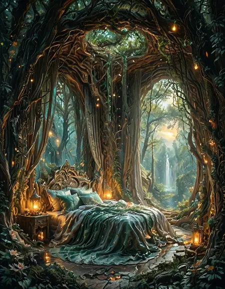 Create indoor elven or elfic bedrooms opened to an outdoor scene of your choice. By default, it's a forest with or without a waterfall and night scene.