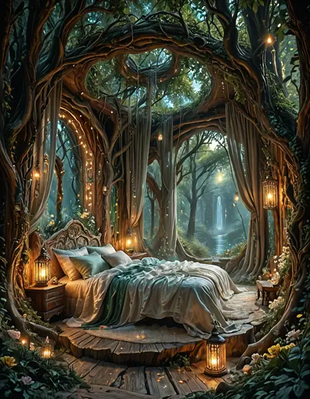 An elegant elfic bedroom inside an ancient tree, glowing wooden walls with veins of bioluminescence, arched crystal windows opening to a moonlit forest, canopy bed with silken sheets, floating lanterns casting magical light, vines and glowing flowers, serene mystical atmosphere, fantasy realism, highly detailed,