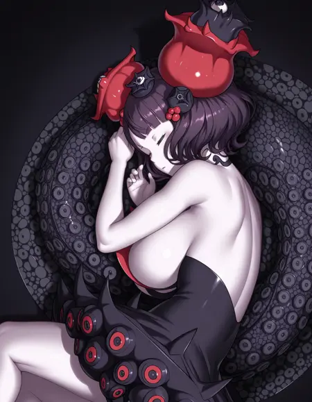 katsushika hokusai \(third ascension\) \(fate\), kh3rd, purple hair, black hair, short hair, hair ornament, red eyes, purple eyes, pale skin, black jacket, bare shoulders, black dress, strapless dress, circle skirt, suction cups