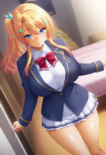 推荐提示词:Miharu Futagawa, blue eyes, blonde hair, long hair, ahoge, side hair, side ponytail, hair ornament, hairclips,