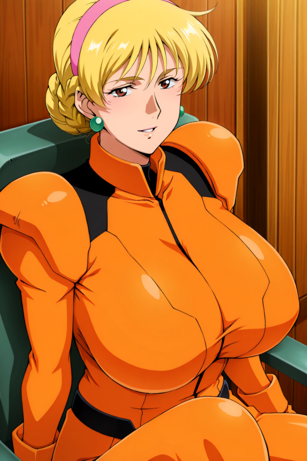 イヤリング、メカパイロットスーツ、オレンジ色のボディスーツ、長袖、オレンジ色の手袋、