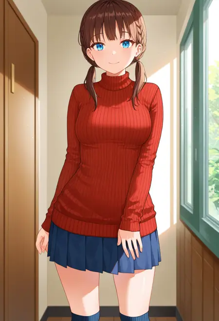 - タートルネックセーター, リブ編みセーター, 長袖, プリーツスカート, ノースリーブ, ローファー,