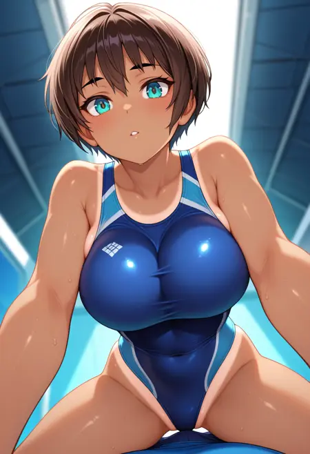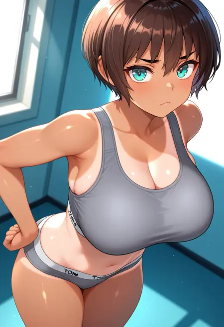 • tsukasaww, tomboy, dark-skinned female, tan, tanlines, aqua eyes, brown hair, short hair, large breasts,