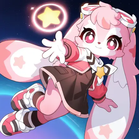 활성화: zhongdimimi, 페르리 여성, 토끼 꼬리, 분홍색 재킷, 긴 소매, 귀에 있는 별 모양 무늬, 검정 및 분홍색 드레스, 어깨 장식 스카프, 스카프의 별 배지, 머리 위에 착용한 분홍빛 하얀 안경, 줄무늬 다리 신발, 분홍색 신발, 줄무늬 밑창, 흰색 속옷