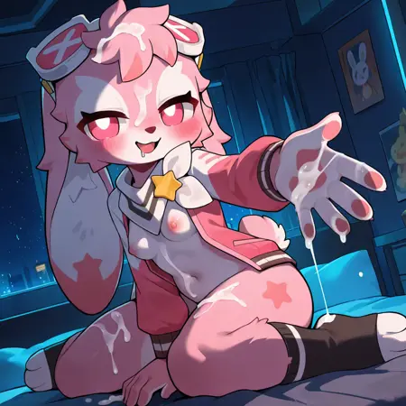 zhongdimimi, furry female, Rabbit tail, pink jacket, long sleeves, the star-shaped patterns on the ears, black and pink dress, shoulder decorative scarf, the star badge on the scarf, the pinkish-white goggles worn on the top of the head, striped legwear, pink footwear, Striped sole, white underwear