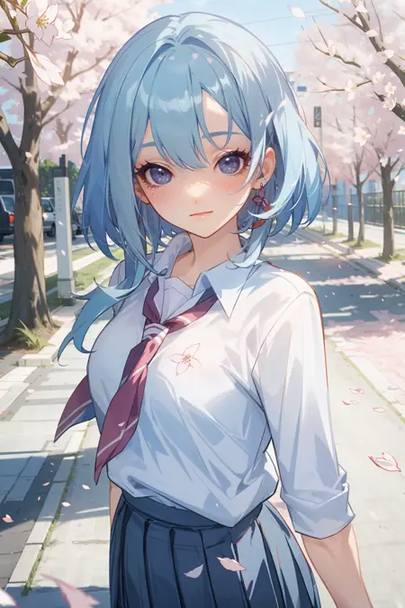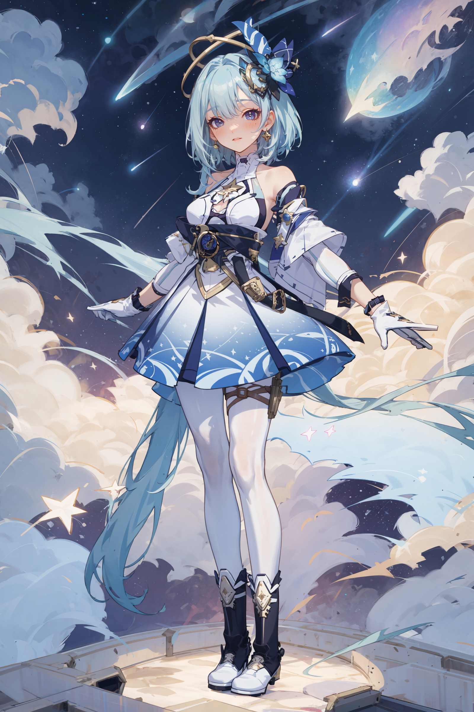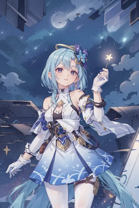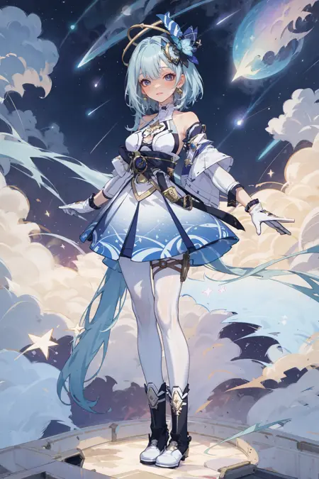 彼女のデフォルト衣装用の追加プロンプト: 髪飾り、イヤリング、白い手袋、ノースリーブドレス、取り外し可能袖、太ももストラップ、白いペチコート、ハイヒールブーツ