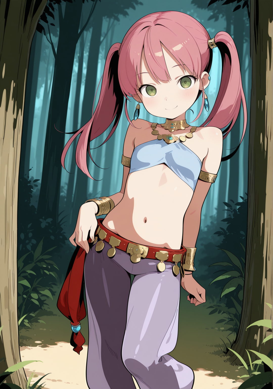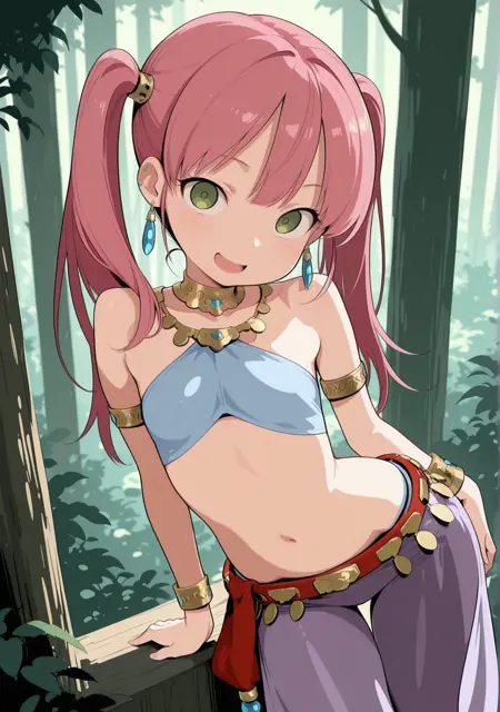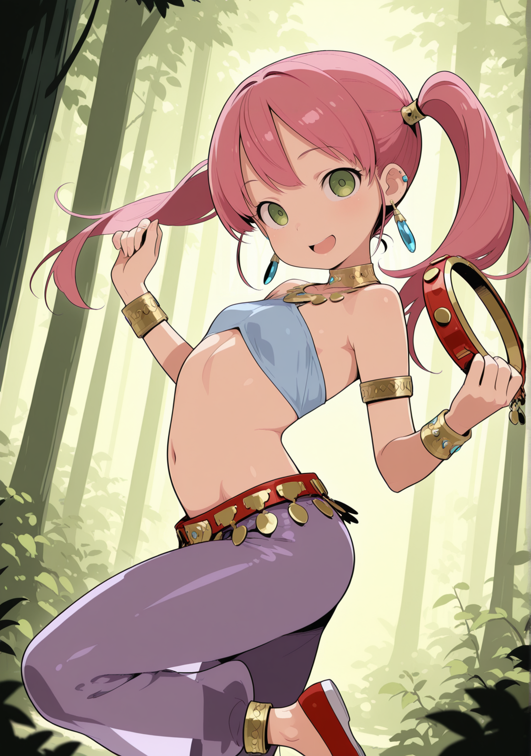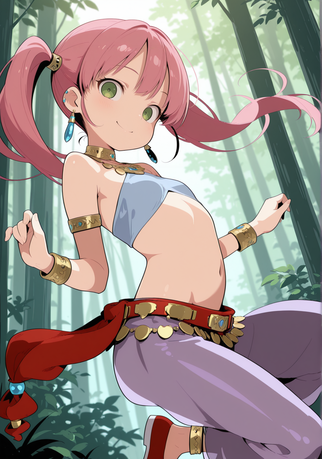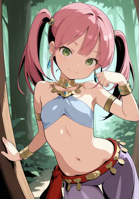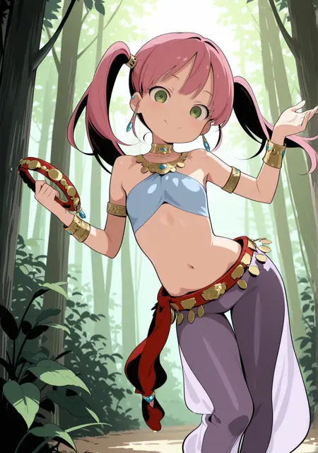 推奨:ピンクの髪、緑の目、ツインテール、腕輪、肩出し、ベルト、ブレスレット、足首輪、アラビア風の服、クロップトップ、ハーネクネック、ハレム服、ネックリング、ネックレス、イヤリング、ハレムズボン、ジュエリー、ロングヘア、へそ、パープルのズボン、レッドの履物、透け感、靴、
