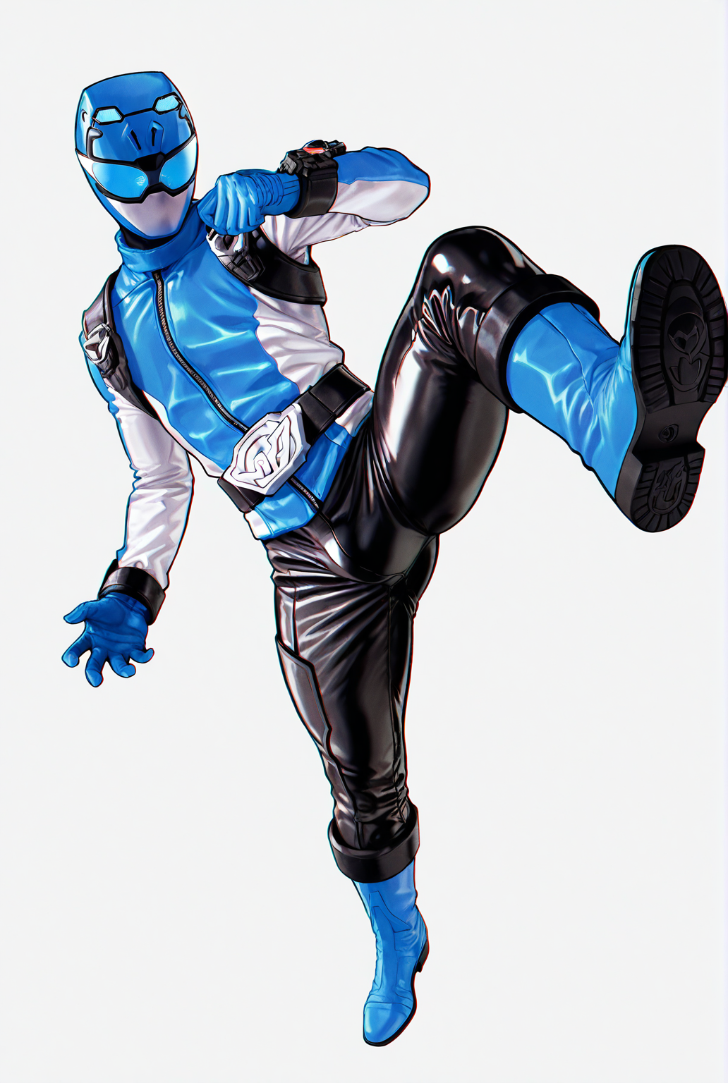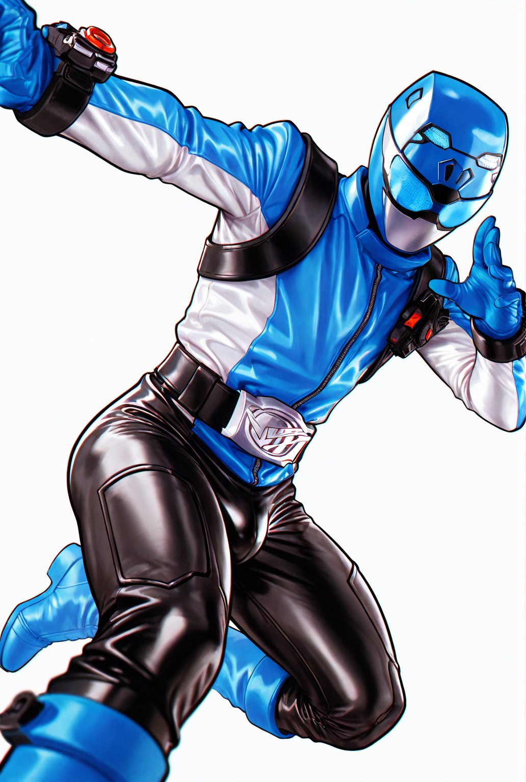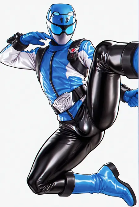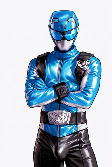 buster blue, tokusatsu, 헬멧, 마스크, 바디수트, 파란 바디수트, 재킷, 장갑, 벨트, 검은 바지, 파란 신발, 부츠