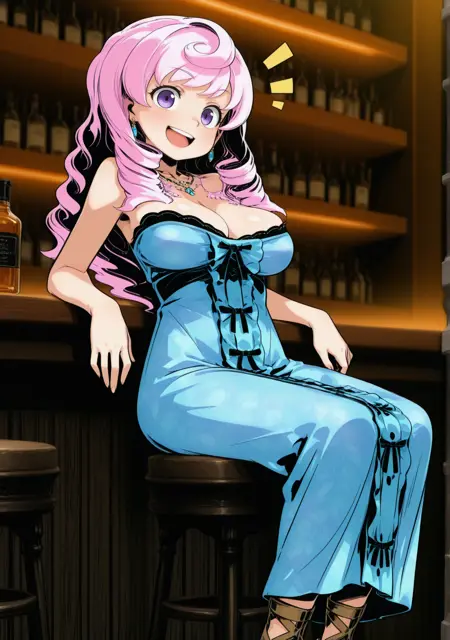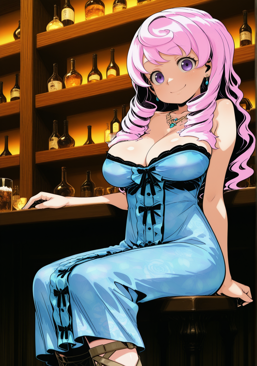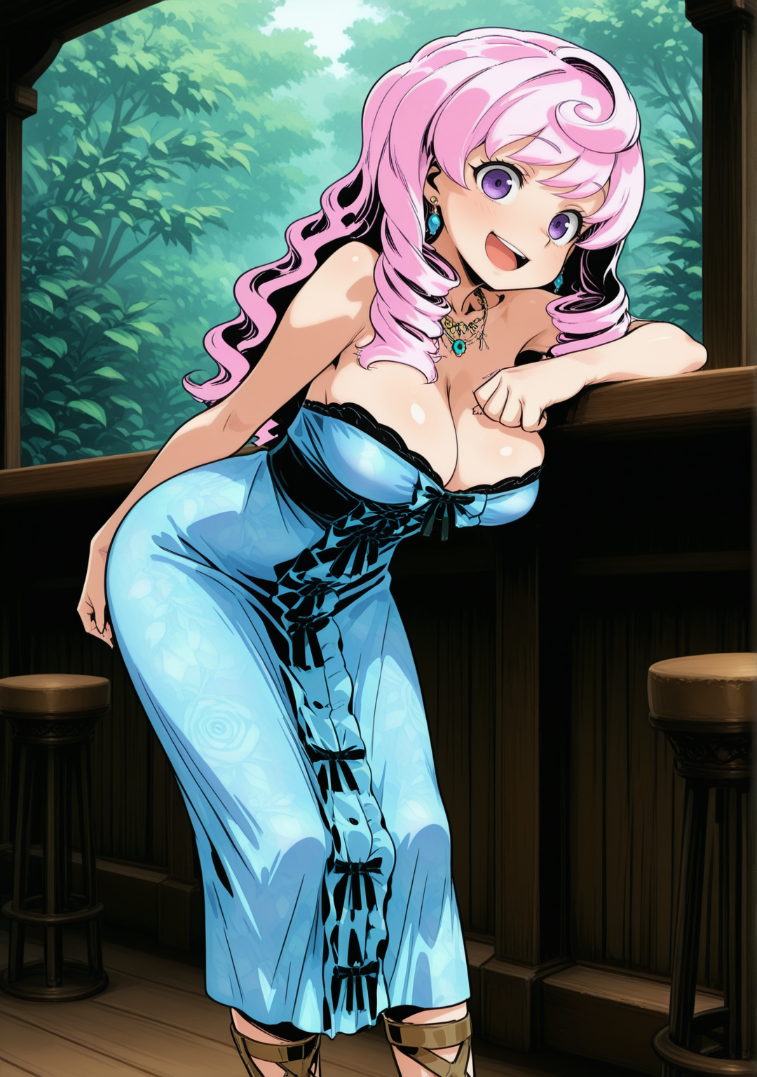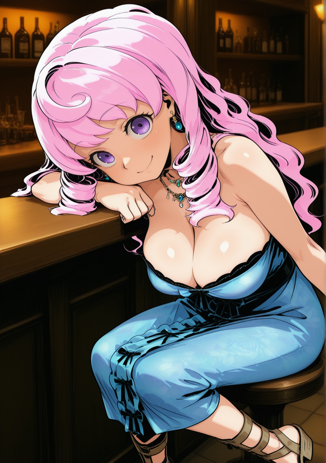 recommend:pink hair,purple eyes,cleavage,bare shoulders,blue dress,curly hair,dress,drill hair,strapless dress,cross-laced footwear,earrings,jewelry,large breasts,long hair,necklace,gladiator sandals,pencil skirt,long dress,