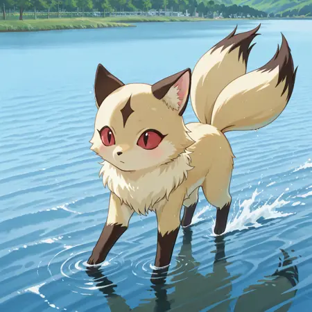 Kirara, 綺羅, Animal, black feet, mark on forehead, black details on tails, two tails, red sclera, slanted eyes,black stripes on tails
