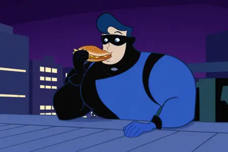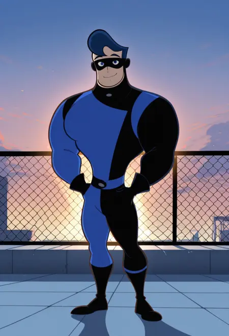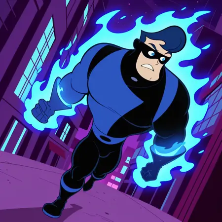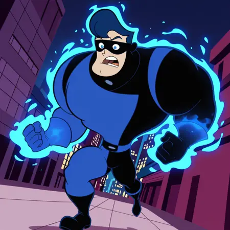 ヘゴ、1人、男性、成熟した男性、白い肌、筋肉質、バルク、濃い青い髪、濃い青い眉、黒いマスク、青い目、丸い耳、青いボディスーツ、黒いボディスーツ、ツートーンボディスーツ、青いベルト、黒い手袋、青い手袋、黒い Boots、青い Boots、光る青いオーラ、