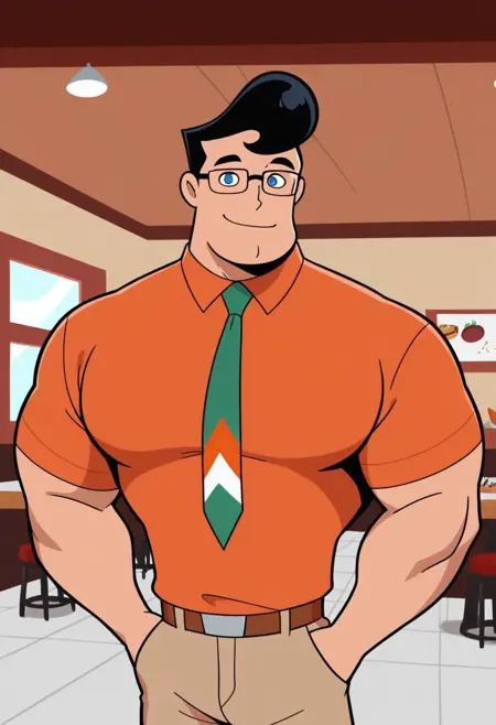 ヘゴSV、1人、男性、成熟した男性、白い肌、筋肉質、バルク、黒い髪、黒い眉、青い目、眼鏡、丸い耳、オレンジ色のカラーシャツ、ネクタイ、茶色のベルト、ターコイズ色のズボン、茶色の靴、