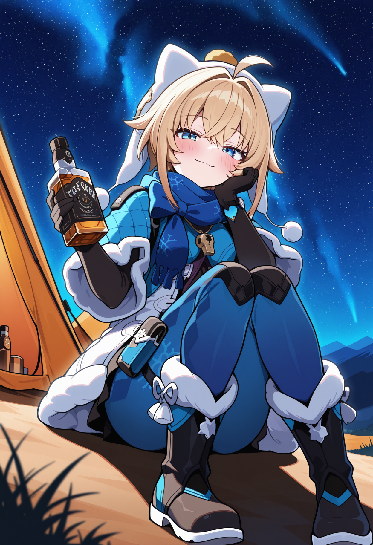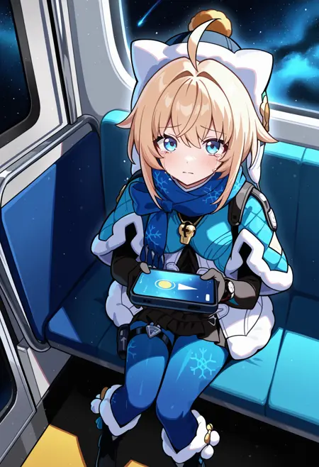 fur trim, blue capelet, fur-trimmed capelet, whistle, white coat, fur trim coat, open coat, black shirt,