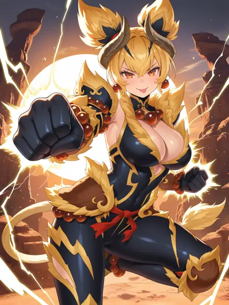 Tags (clothes): Rajang Armor, fur trim, bead earrings, red prayer beads, yellow elbow gloves, black bodysuit, brown faulds, yellow shoes, lion tail