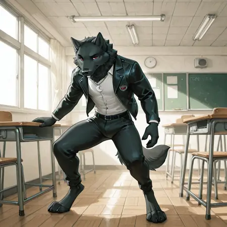 Fuyukage_K, wolf, anthro, black fur, red eyes, moon necklace
