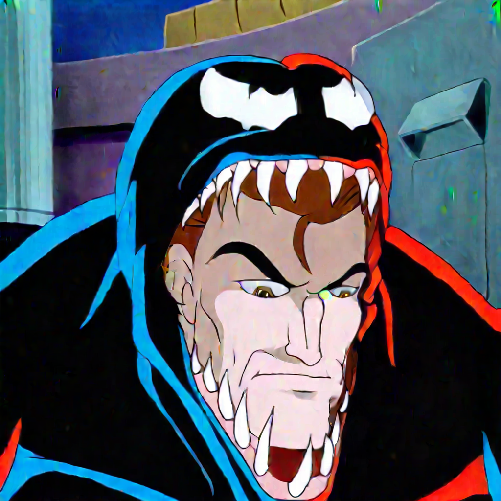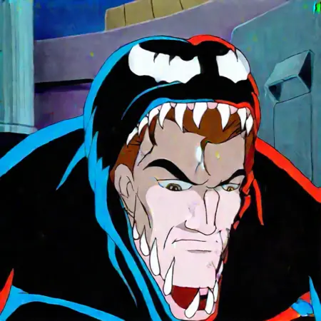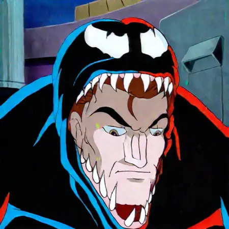 스파이더맨: 애니메이티드 시리즈의 베놈이 호스트인 에디 브로크의 얼굴을 드러내며, 베놈의 입이 에디의 얼굴 주변에 형성되어 있다.
