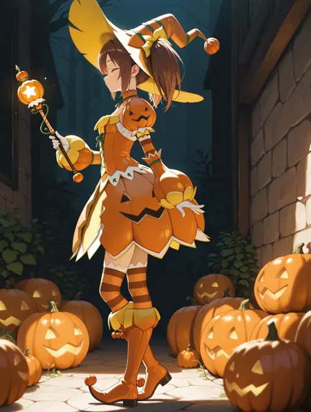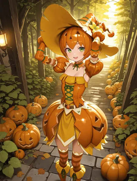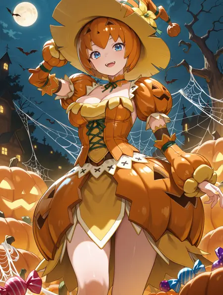 Tags (clothes): mosgharl armor, halloween costume, orange witch hat, pumpkin hair ornament, orange detached collar, orange corset, orange dress, orange elbow gloves, striped thighhighs, orange knee boots