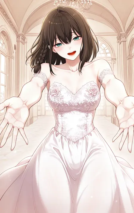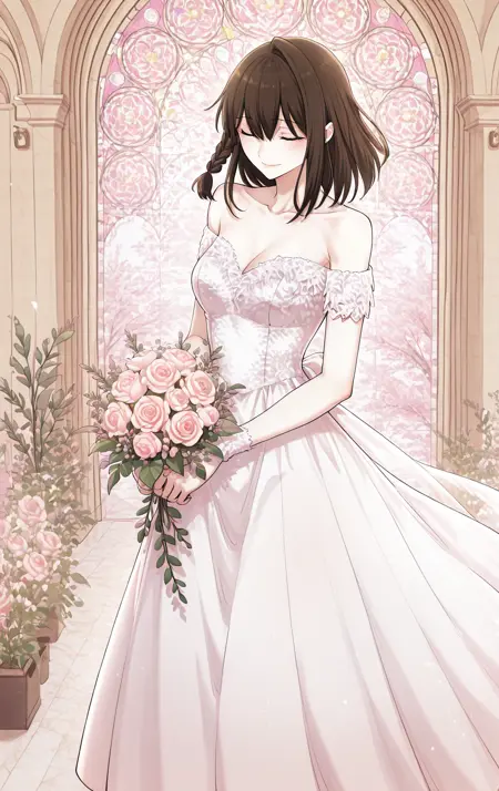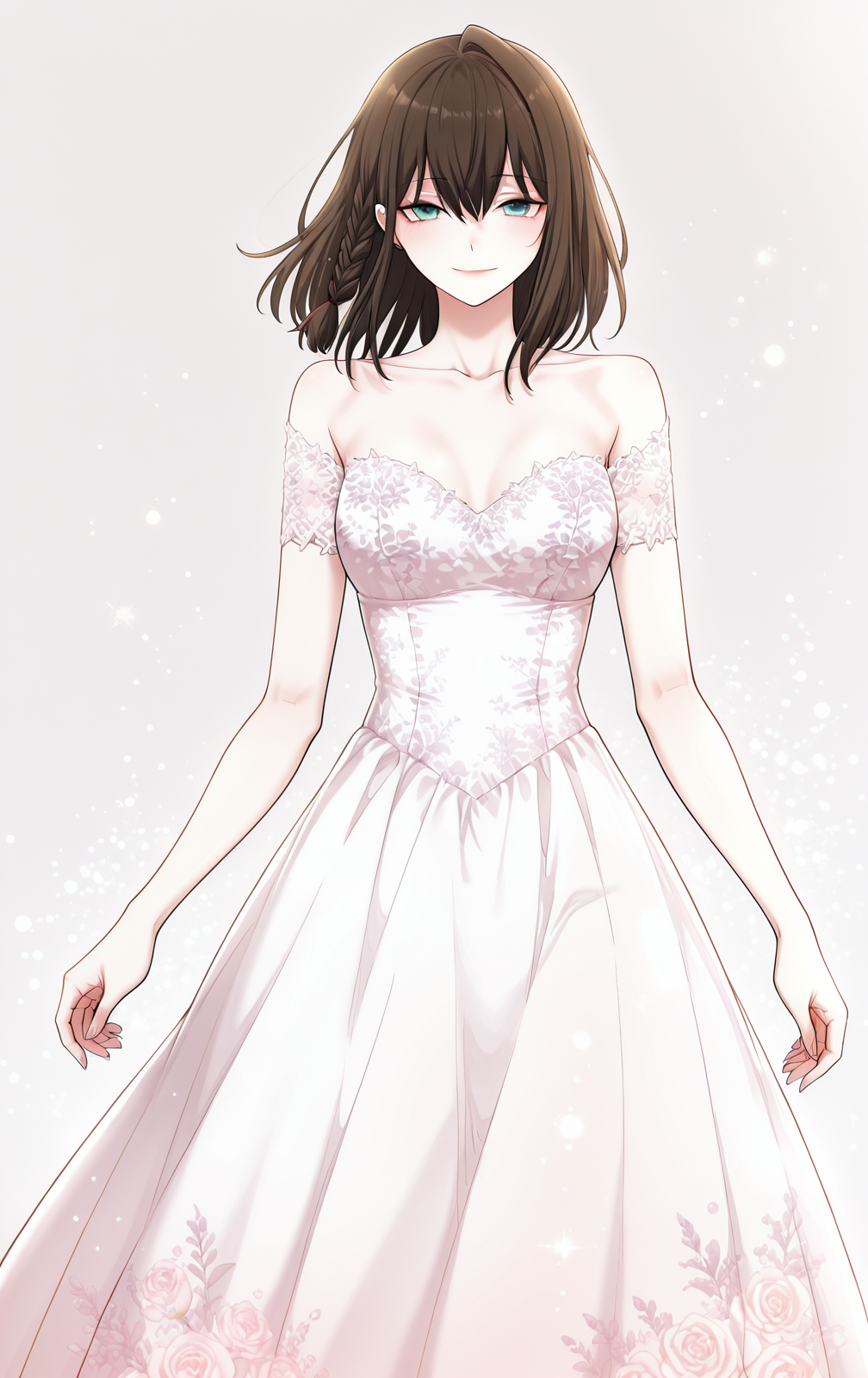 Yoonariv3_outfit3, white wedding dress, off shoulder dress, collarbone, floral embroidery, lace trim, sleeveless dress, white lace armlet, long skirt,